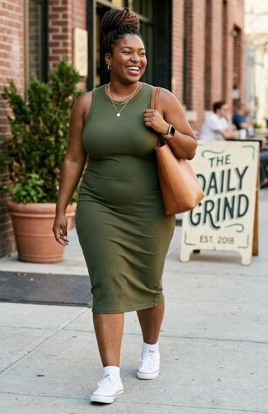 A bodycon midi dress is a baddie essential because it highlights your curves while remaining comfortable. For a casual daytime vibe, style it with white sneakers and a denim jacket. Add layered gold jewelry and a sleek hairstyle to elevate the look.