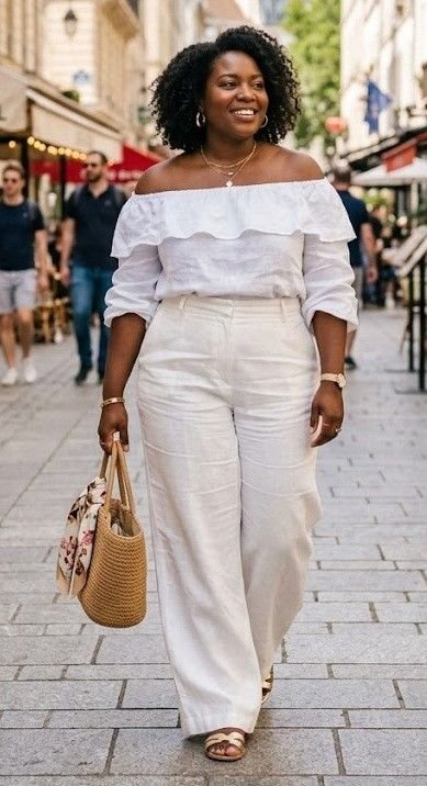 For a slightly dressier outfit, combine an off-shoulder blouse with wide-leg trousers. The off-shoulder design highlights your neckline and shoulders while the loose pants keep you cool in hot weather. Choose breathable fabrics like cotton or linen to stay comfortable in summer heat.