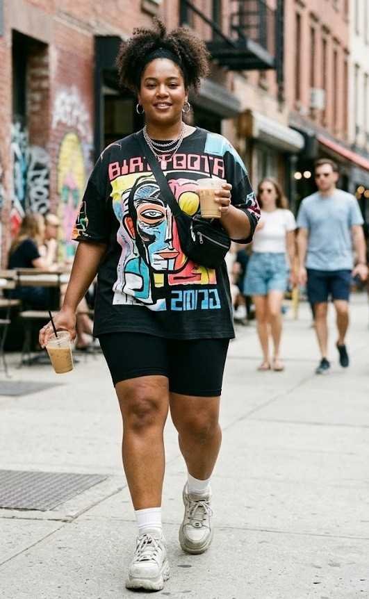 Athleisure meets baddie energy in this comfortable yet stylish outfit. An oversized graphic tee paired with biker shorts creates a relaxed silhouette while still looking trendy. Finish the look with chunky sneakers, tube socks, and a crossbody bag. You can also tie the tee at the waist for a more fitted look.