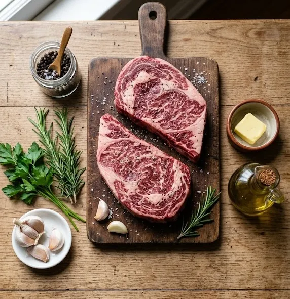 Take the ribeye steaks out of the refrigerator and let them sit at room temperature for 20–30 minutes. This helps them cook evenly. Pat them dry, then rub with olive oil, salt, and pepper.