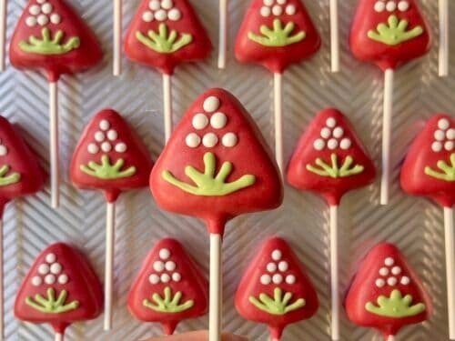 Dip each cake pop into melted strawberry candy melts, coating evenly.